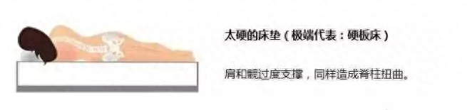 睡硬板床时,人体的重力集中在头、肩、臀、脚处,硬板床在过度支撑肩部和臀部的同时,腰部却处于无支撑的悬空状态,导致脊柱扭曲。