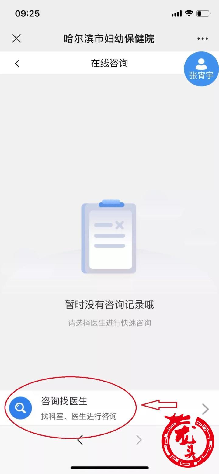 第一步:关注哈尔滨市妇幼保健院微信公众号,在底部菜单栏点击“医院资讯”—“网上问诊”